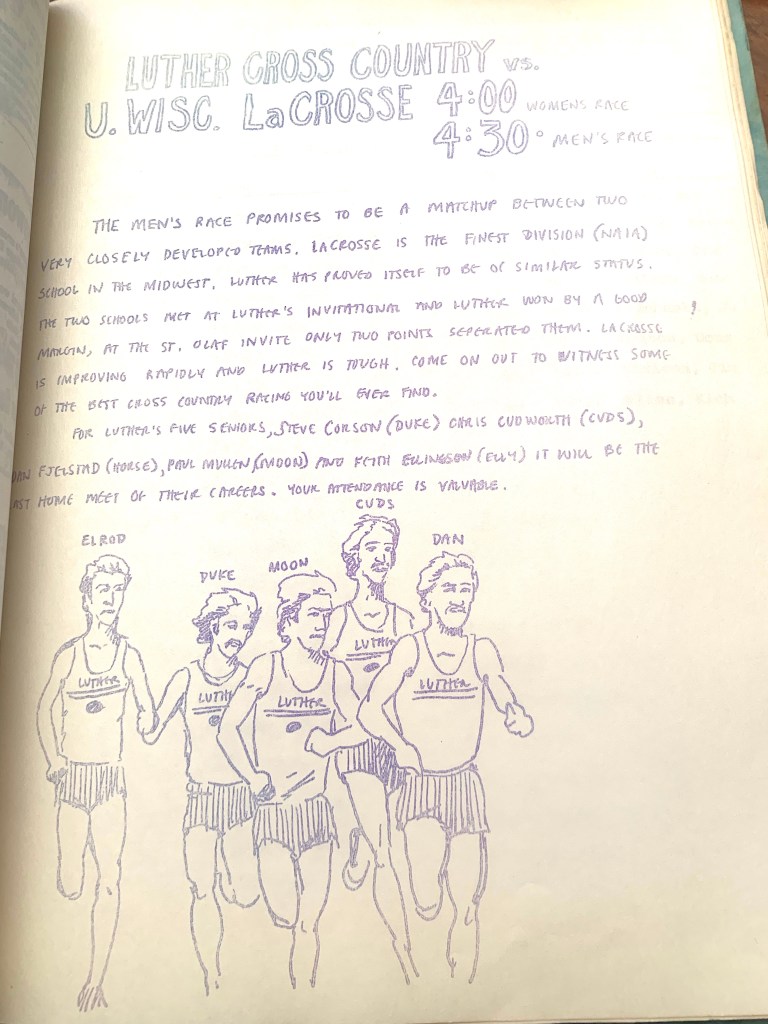 That Tuesday, we raced against our perennial rivals from the University of Wisconsin-LaCrosse. I’d always run my best races against them in both track and cross country. We’d lost to them in dual meets those first couple seasons at Luther because the Hanson brothers Jim and Joe were too much of a one-two punch. But we’d built up confidence over the years and stood a great chance of winning that dual. I drew up a flier to post around campus to let people know what a great race it might be.