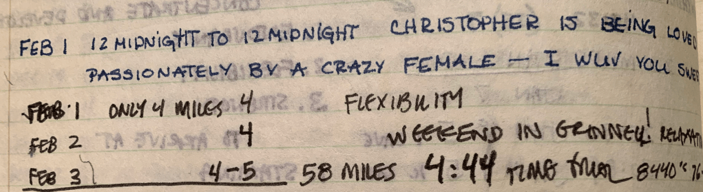 At the end of January Term, with a mere197 miles under my belt, it was time to get serious about training. But there was also the question of a serious relationship going on, and I didn’t mind that one bit. At some point my girlfriend grabbed my running journal and wrote me a note…