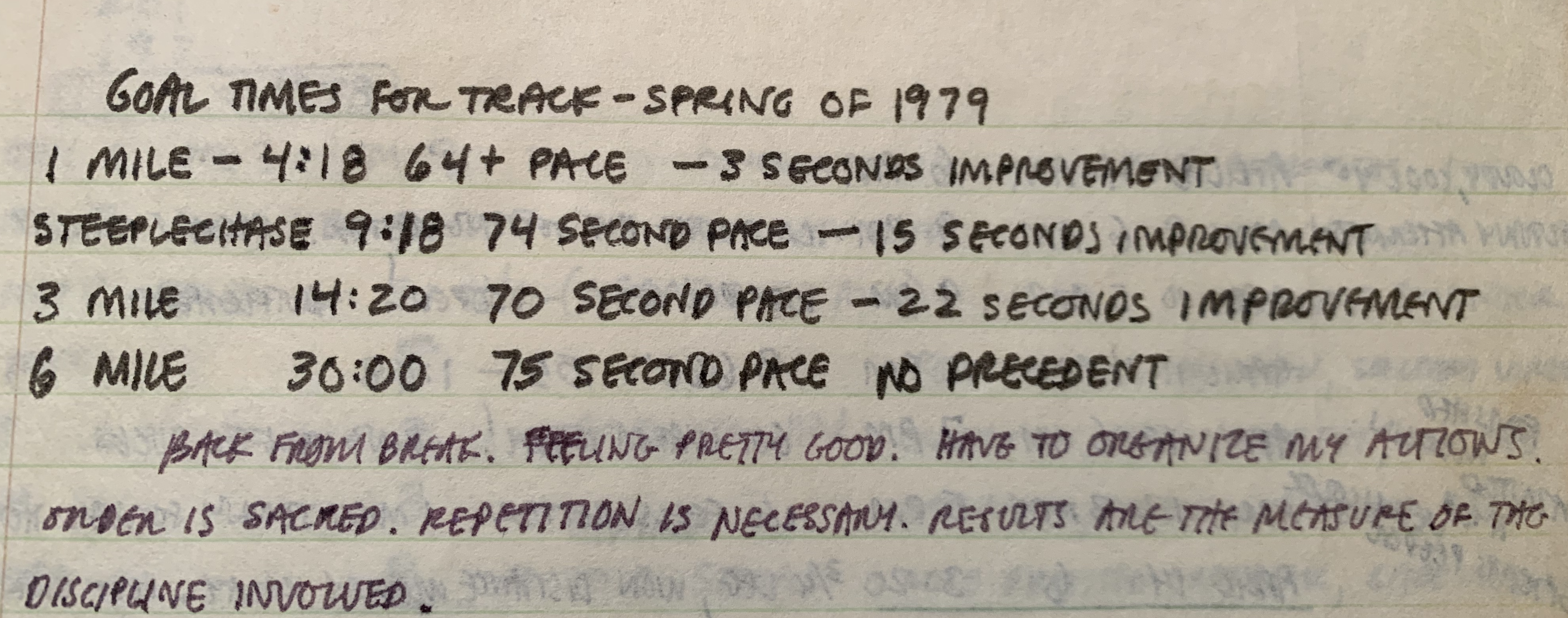 The weather warmed into the 60s the third week of March, as my girlfriend and I traded visits while at home in Illinois. I ran four mile intervals under 5:00 per mile, then banged out a 14-miler a couple days later in 1:35. That was sub-7:00 pace. I was starting to feel real fitness and wound up the week with 82 miles. I wrote down some goals for the spring.