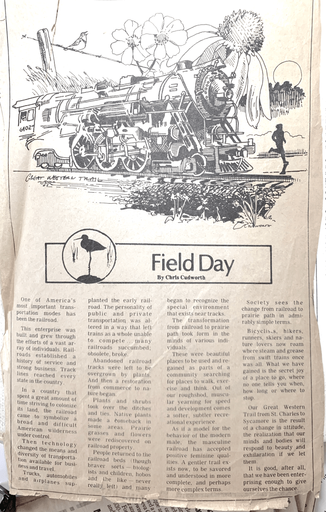 The Rails-To-Trails movement in Illinois started in the early 1980s. The most significant development in the Fox Valley where I lived was the conversion of the Great Western railroad tracks to a running and cycling path. Most of the training I’d done since the early 70s when I started running was on athletic fields, in forest preserves, or on the roads. Having a trail dedicated to running was, at that time, a welcome novelty.