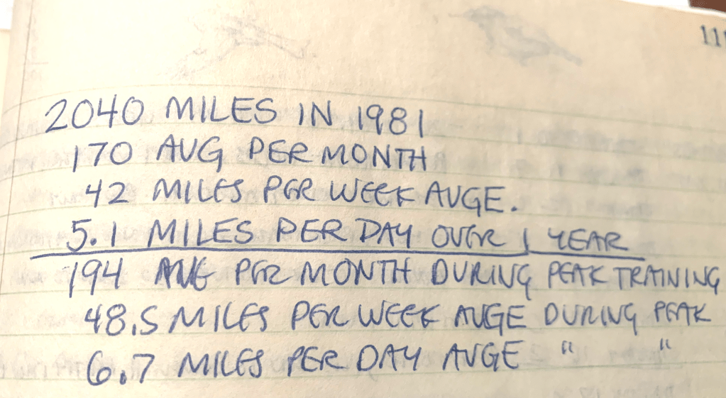 I wrote up a year’s training summary that read, “2040 miles in 1981. 170 avg per month. 5.1 miles per day. 194 avg during peak training. 48.5 miles per week average during peak. 6.7 miles per day.”