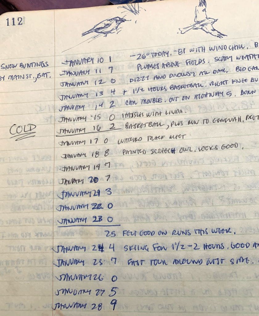 I ran just 100 miles for the month of January, but also did some cross country skiing on days when it wasn’t below zero, so my fitness still improved along with several long sessions of basketball. Typically I’d play for three to four hours. Sometimes I was joined by one or more of my brothers, whoever was in town.
