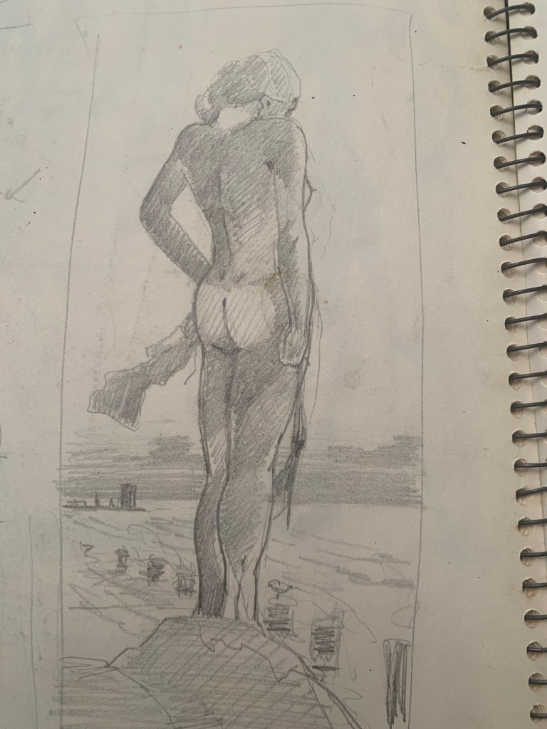 Her laissez faire impressed me on many levels. Despite all my native lusts and fantasies, I’d let her slip away. That was sad, because I’d recently done a drawing of a fantasy girl by the beach. Yet here I’d been in the presence of a real woman eager to do what she wanted with her own body, and I’d stumbled into shyness. In that regard, she reminded me of the character Bo Derek played in the movie “10,” and I was about as awkward as the Dudley Moore character. Perhaps I had Linda ––my own Julie Andrews character––in the back of my mind as well.
