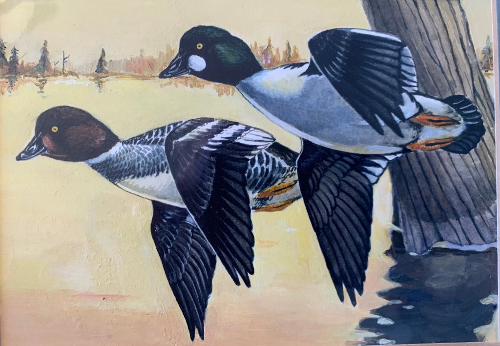 Between job hunting, I dug into painting an entry for the Federal Duck Stamp contest. I chose to paint a pair of goldeneye ducks. While it was a credible effort, I struggled with the details for lack of reference material. Most of the top wildlife and duck stamp painters used highly detailed photography to copy in producing their art. I’d studied plenty of goldeneyes on the Fox River in St. Charles, and I knew how they flew and how they generally looked. But when it comes to choosing artwork for the Federal Duck stamp, the winning pieces often looked like glamorized photographs. The allure of the contest is that whoever won typically became an instant millionaire. But I wasn’t quite there yet as an artist.