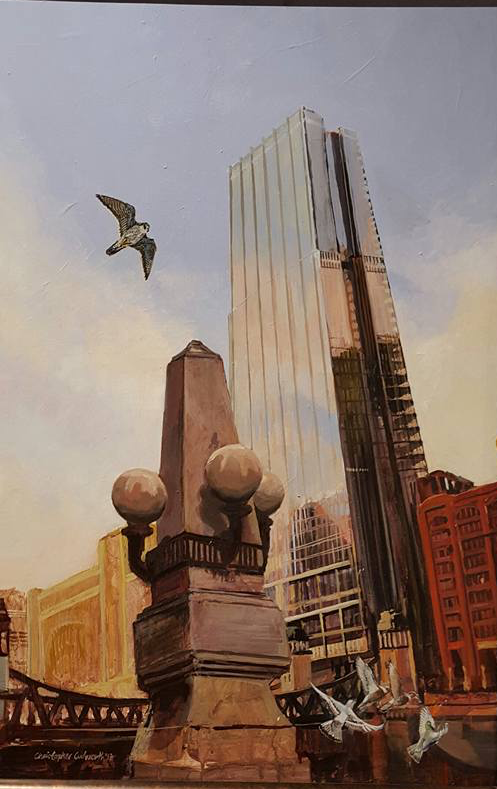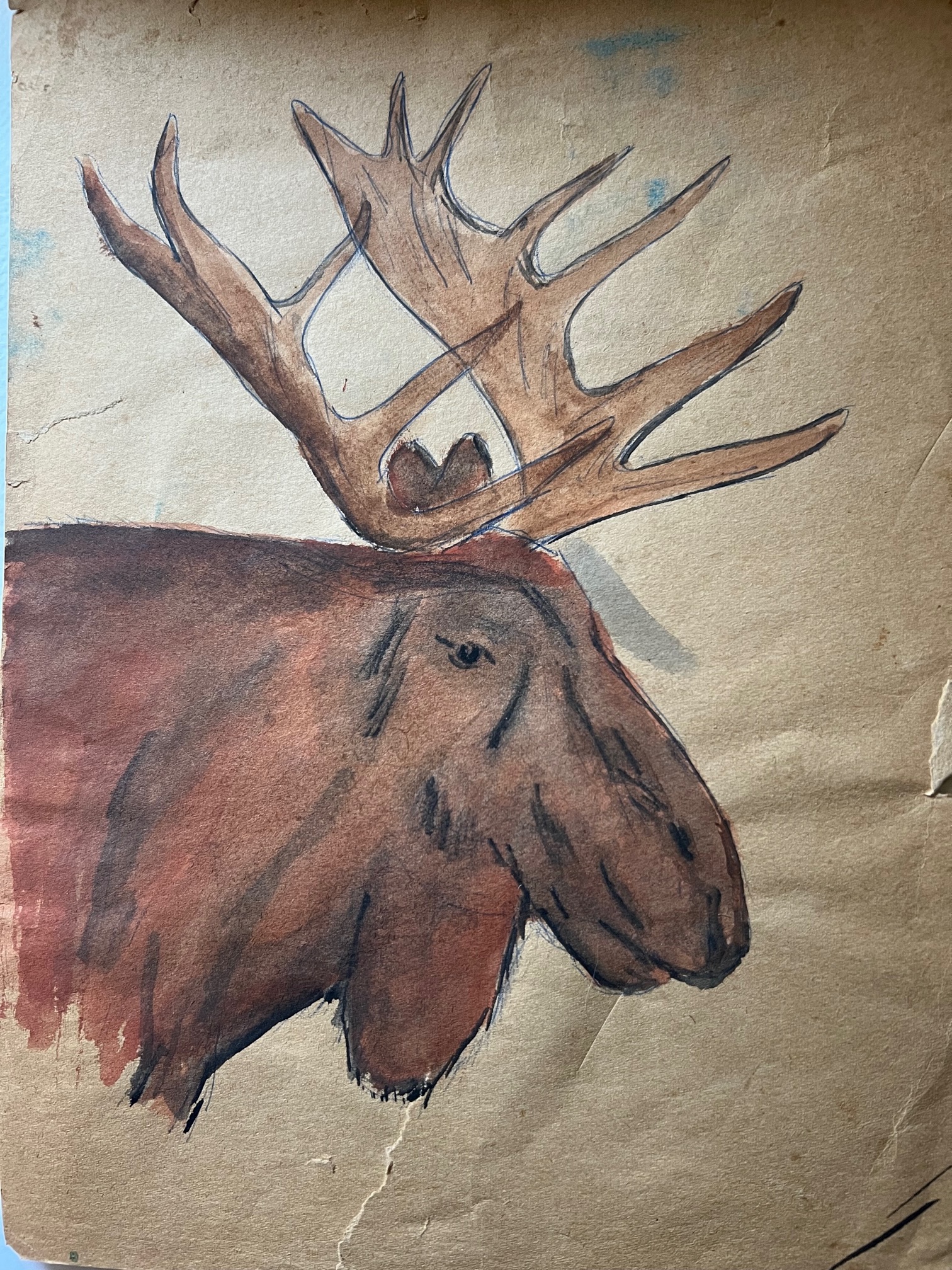 He was a brilliant man in many ways, and in some respects, he even suppressed certain talents in favor of more practical pursuits. As far as I know, the sole example of his artistic talents remains in my possession. It is a watercolor and ink painting of a male moose. Why he chose the subject matter I do not know. He did have a strong association with nature and grew up hunting on the Upstate New York farm. Later in life when I took to painting birds, my father sold my work to friends and even framed it up to show in local restaurants. As a result, one of my paintings of downtown St. Charles, Illinois, hung in the Manor Pancake House for more than forty years. My father got me that commission.