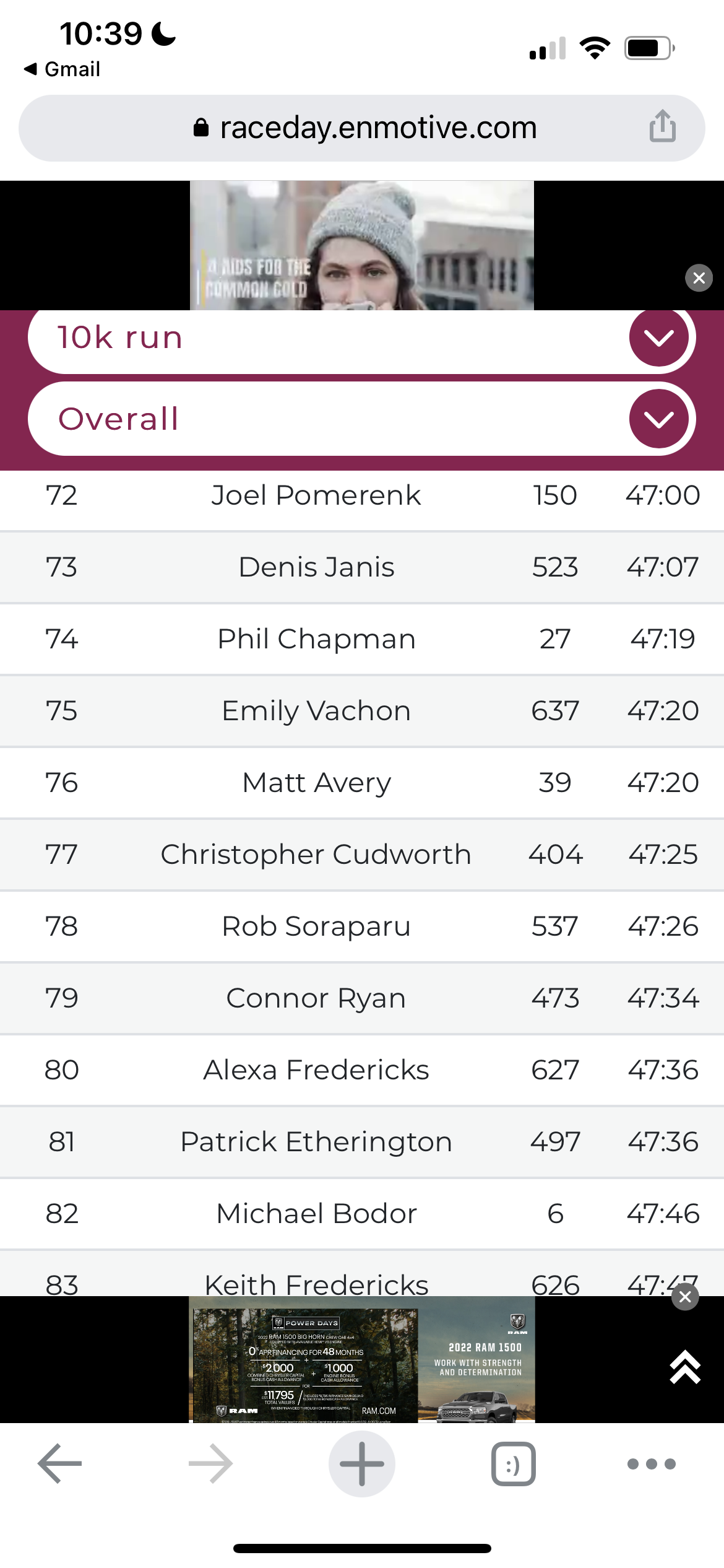 The fifth mile had a couple turns that slowed my pace a bit. I passed that mile in 7:36. The sixth mile had some inclines and I managed a 7:49. But with .2 of a mile to go, the road turned down a slight downhill. I raised the pace in a kick. In all, I ran 47:25 according to the race clock, but my Garmin showed 47:04. I’d also started a bit back from the starting line and noticed that my times and distances were slightly off from the mile markers along the way. My Garmin congratulated me for the fastest 5K (I think it was 23:45 or something like that) and third-fastest 10K.