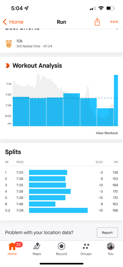 The second mile passed in 7:36, just a touch slower than the first. There were many turns in that section of the race, and I kept to the corners the best I could, but ultimately saw that I’d run 6.26 miles according to Garmin and Strava. You have to run the tangents to be most effective in a race.
