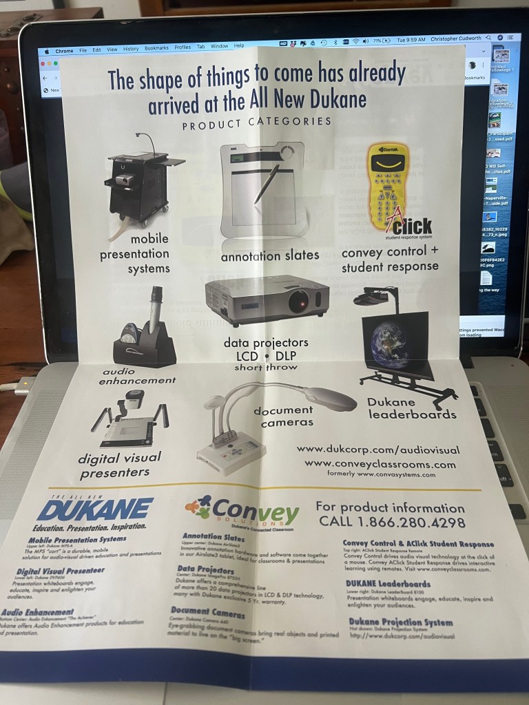 Dukane was likely trying to do too much, too soon, in a market that was changing so rapidly that you had to have money to burn in order to compete. Education moved quite quickly away from classroom presentation or student response systems to in-hand Chromebooks and online learning. Once laptops became more affordable the control it put in student’s hands was absolute. I substitute teach in many public school systems and online learning is massive. Frankly I’d been caught up in changing industries in both the newspaper and audio-visual business. Yet I remain proud of the work that I did at Dukane. I loved that tagline Education. Presentation. Inspiration. It kicks ass.
