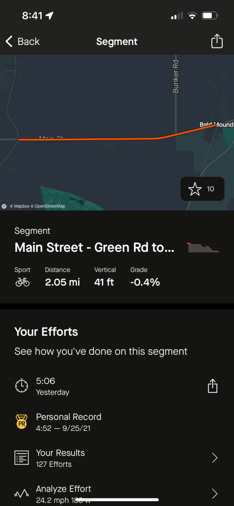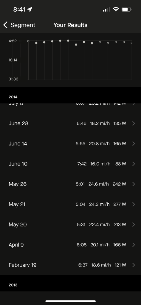 I can analyze all 127 efforts over the past eleven years for which Strava has records, but I’m too lazy. Besides, I don’t always ride all-out or even pay attention to it as a segment.