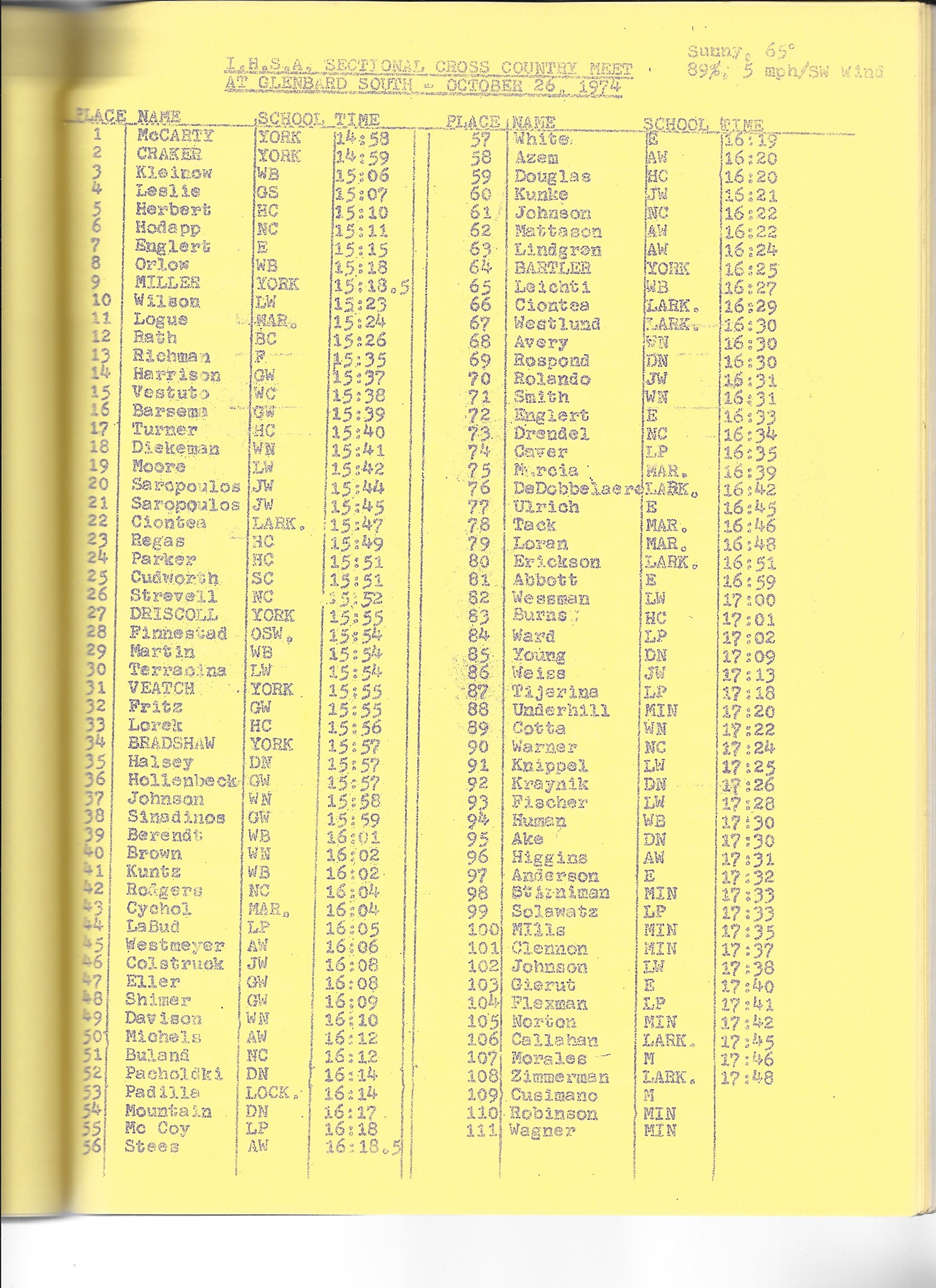 In 1973, as a junior at St. Charles, I led our team to a 28-29 victory over the Naperville Redskins (yes, that was their school mascot then) beating two of the top runners in the conference, Bob Warner and Rick Hodapp. Our victory snapped their 62 dual meet winning streak and set us up to have a 9-2 dual meet record ourselves that year.