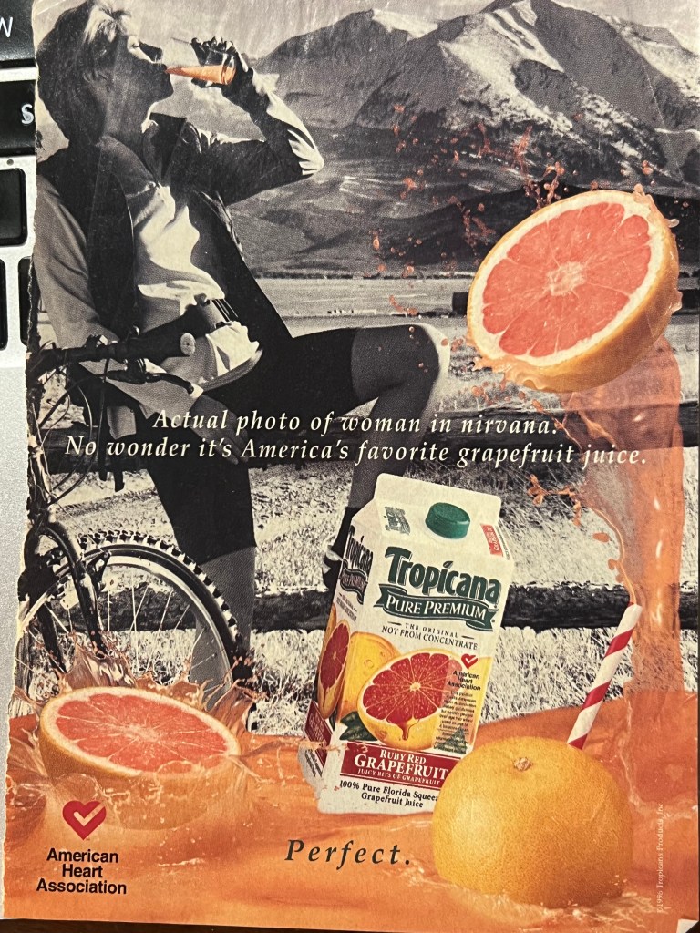 • You can take a photo of your erection and insert is subliminally in a Tropicana ad like the one shown here, Look closely at the flow of juice at the lower right. There’s definitely the head and shaft of a dick in there. And what’s she doing with her hand? It’s true. Sex sells. Even if it’s subliminal. I clipped this ad out of Reader’s Digest years ago. Mystery Achievement, so unreallll.