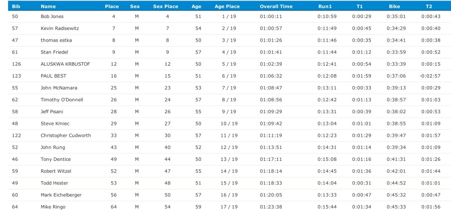 The men’s age-group winner Bob Jones and several other competitors in the 50-59 age group were within 5 minutes of the overall winner.