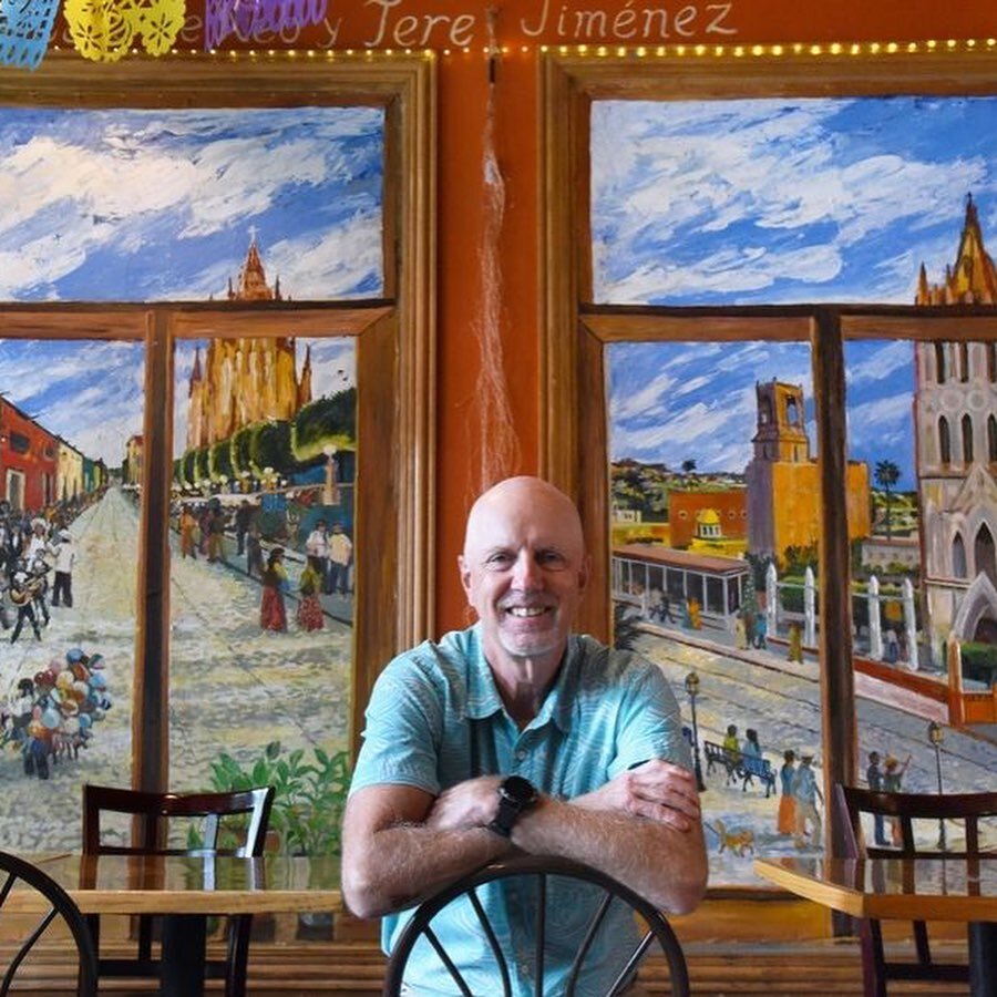 Posing in front of the murals I produced for the Santa Fe restaurant in 2021.