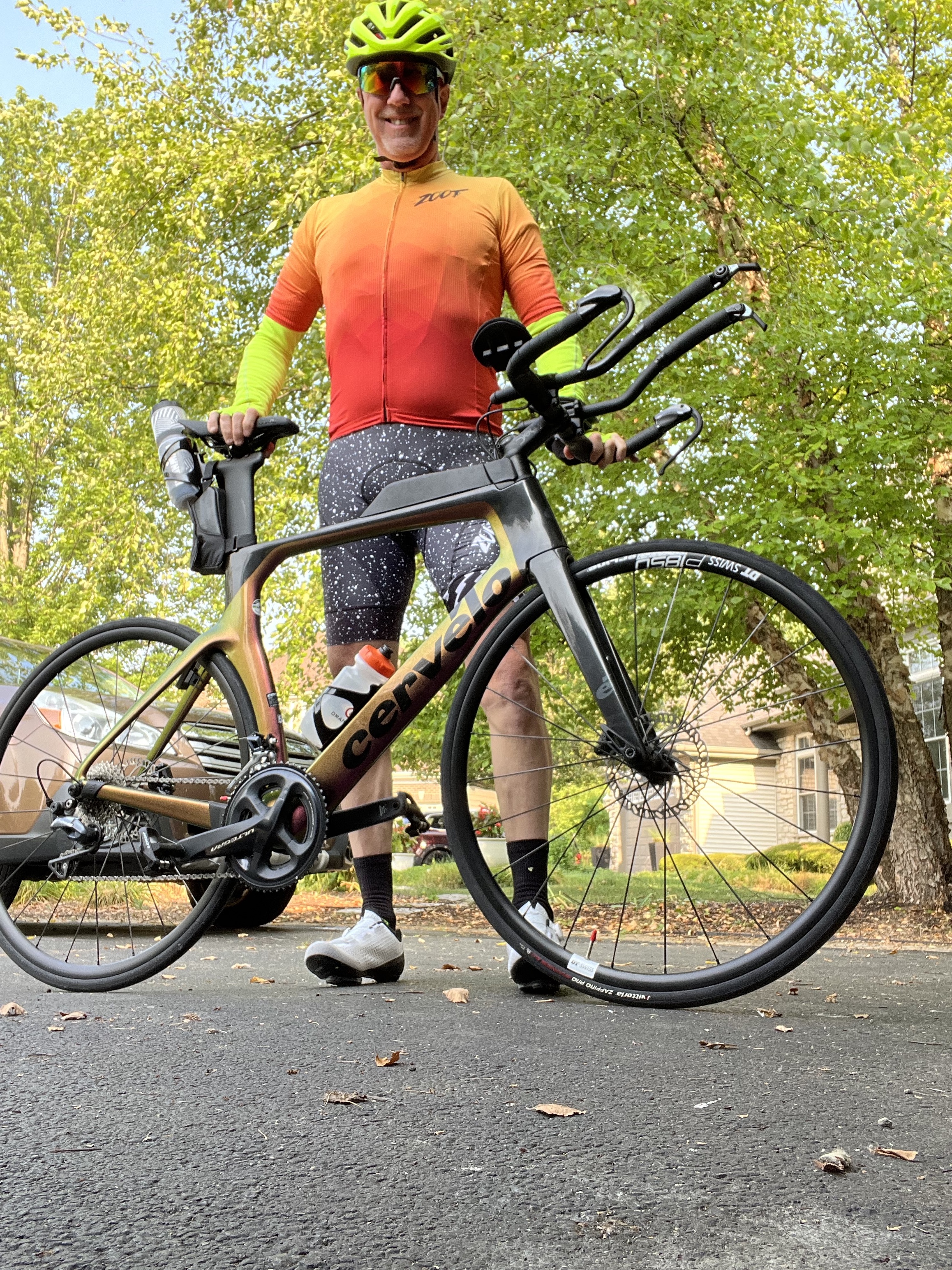 I’d done enough bike workouts to figure that a 21 mph average was possible for me over 13 miles. A few weeks back during a Swedish Days group ride with some faster friends, I’d managed 22 miles at 21 mph on my Felt road bike in a group ride. So I knew the legs were in decent enough shape. The new Cervelo Tri-Bike in aero should deliver the same level of performance, I figured.