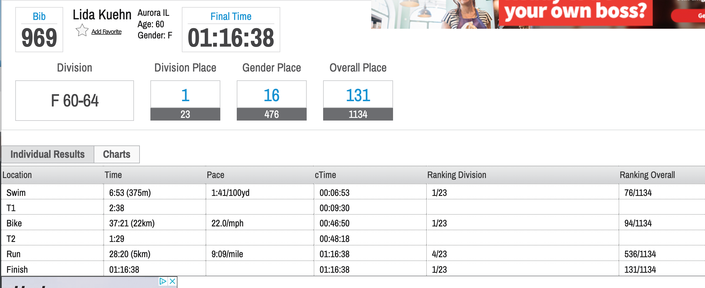 And, she won her age group yesterday! Even with all the turns in the swim course, she swam 6:53 to complete it. Her bike pace was 22 mph and she ran 9:09 miles for the women’s 60-64 group win.