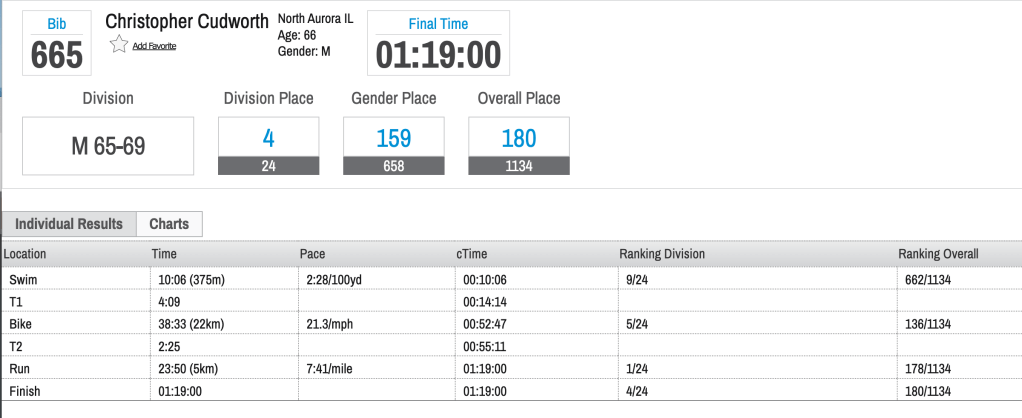 I was not so fortunate, placing fourth in the 65-69 age group division after a travesty of a swim segment in which I stopped and started so many times it did not qualify as a “swim” so much as a paddlefest through dozens of competitors thrashing the water from start to finish. Perhaps I should have started at the back of the 6-8:00 group rather than in the middle of the 8-10 group where much slower swimmers got out ahead of me, creating an impenetrable logjam through which I did not navigate well.