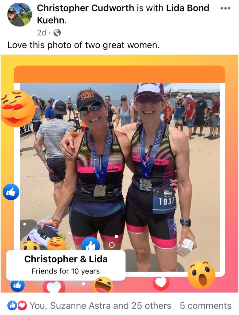 Lida Bond Keuhn (left) with my now-wife Suzanne Astra. Lida met me first when we competed in the Naperville Sprint triathlon relay ten years ago. While Sue rode the bike portion, Lida “vetted” me and declared me a “nice guy” so I ‘passed the girlfriend test as we began our relationship. We got married six years ago.