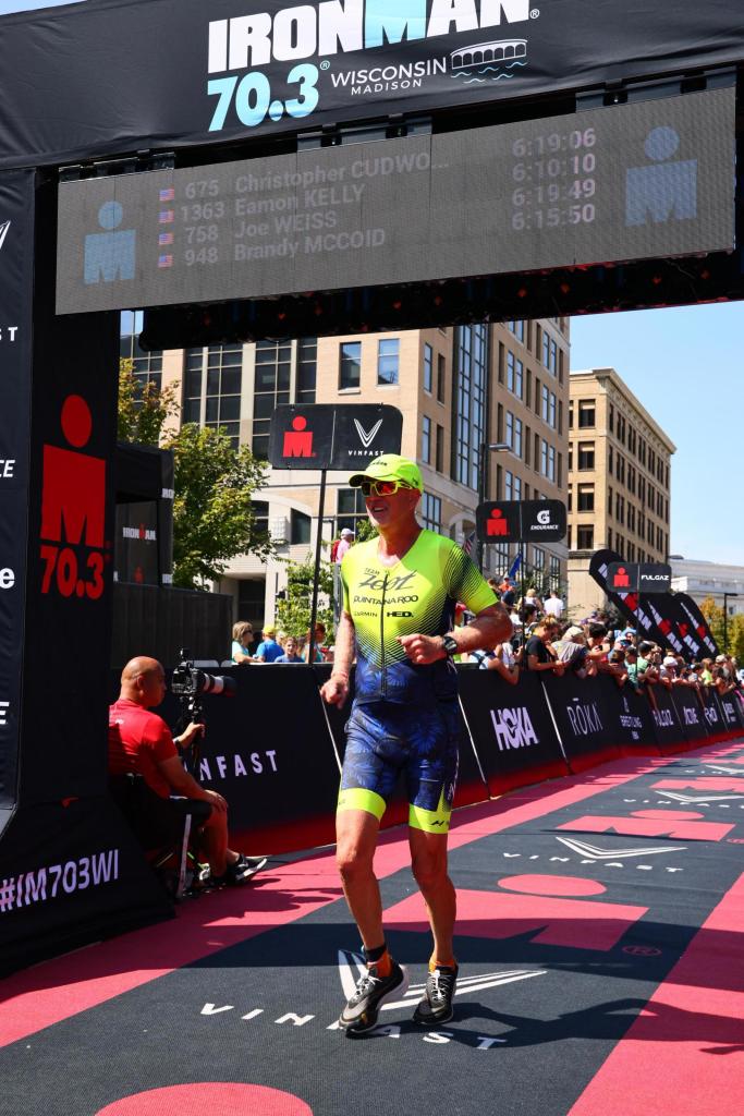 Coming into the finish line at Ironman Wisconsin 70.3, I made sure to slap a few hands along the crowd gathered outside the fencing. Perhaps that’s another DQ, but if it is I don’t give a damn. It was sweet to hear my name announced loud and clear as I trotted on the red carpet under the giant IM Finish ballon. “Christopher Cudworth, sixty-six years young from North Aurora, Illinois,” the announcer called out. ”